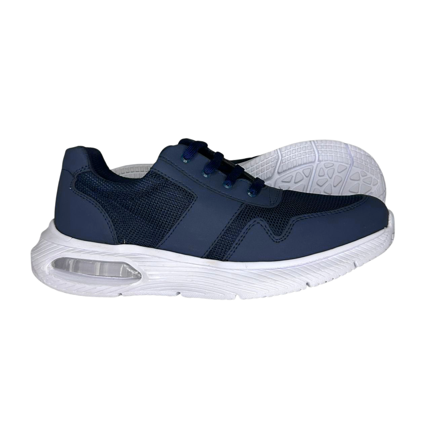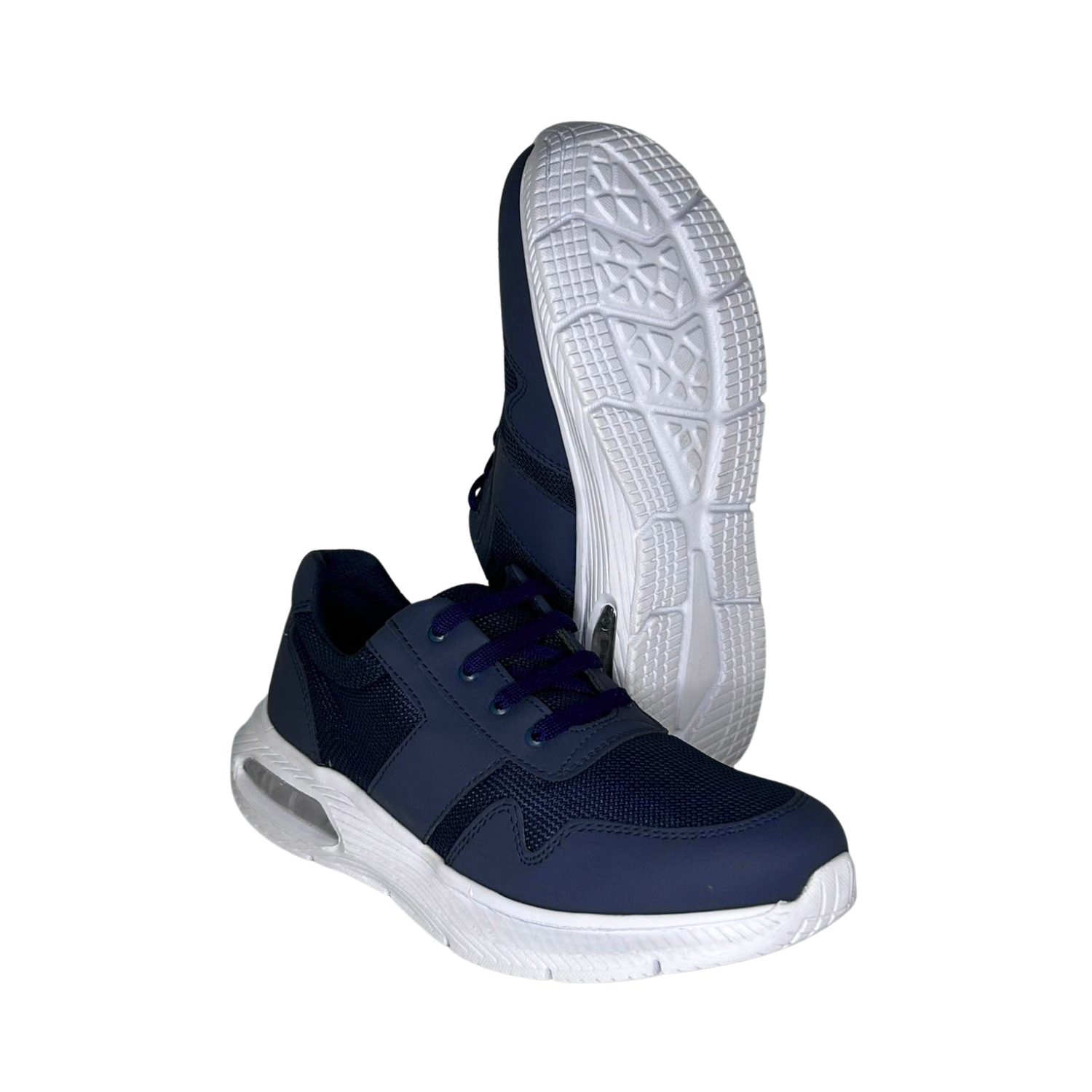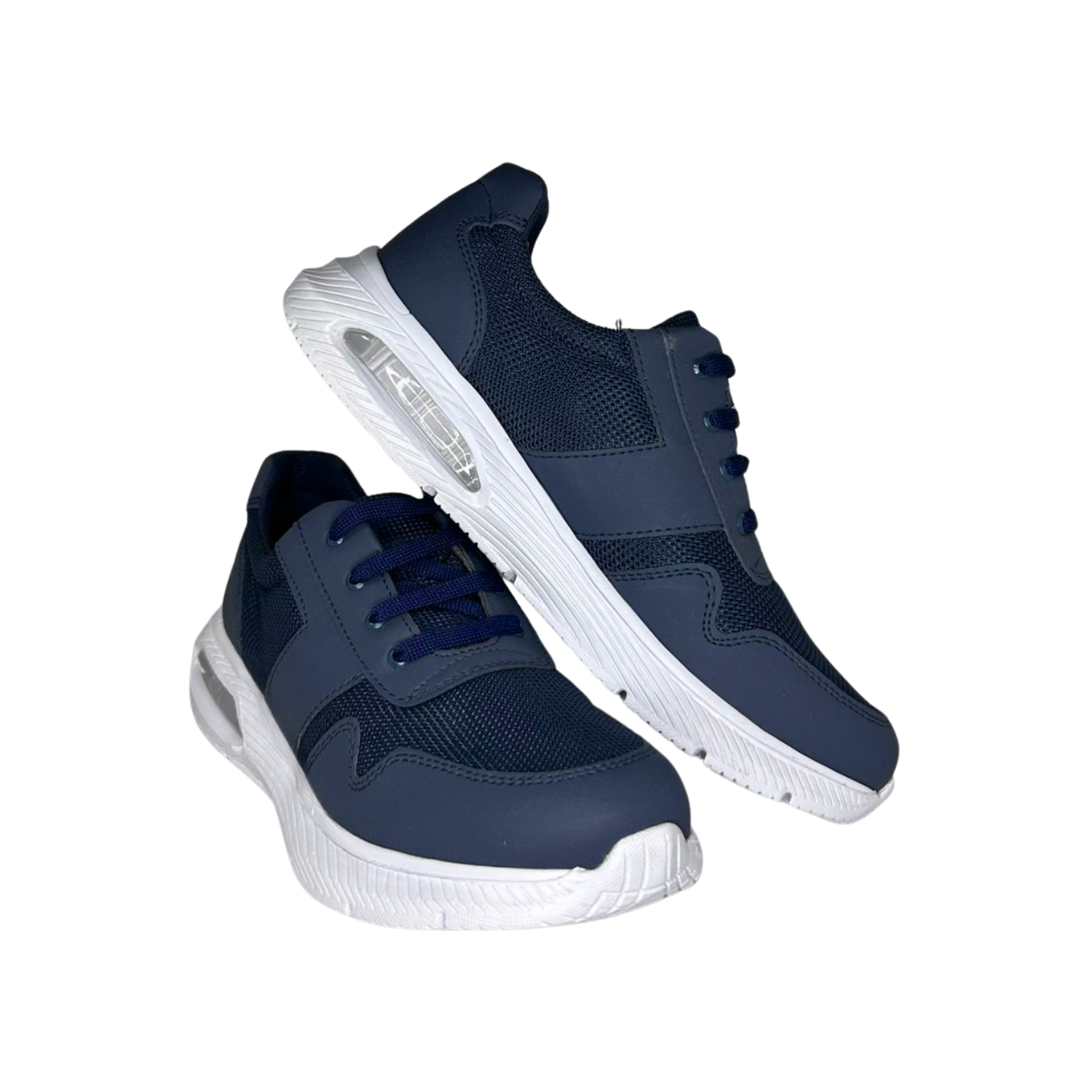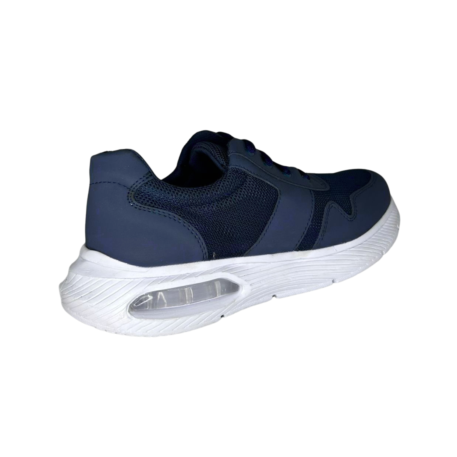 Calzado azul con plantilla removible de memory foam, forro en chinela y laterales, suela Phylon antiderrapante con burbuja de gel, construcción Strobel montado-pegado y ancho EE
